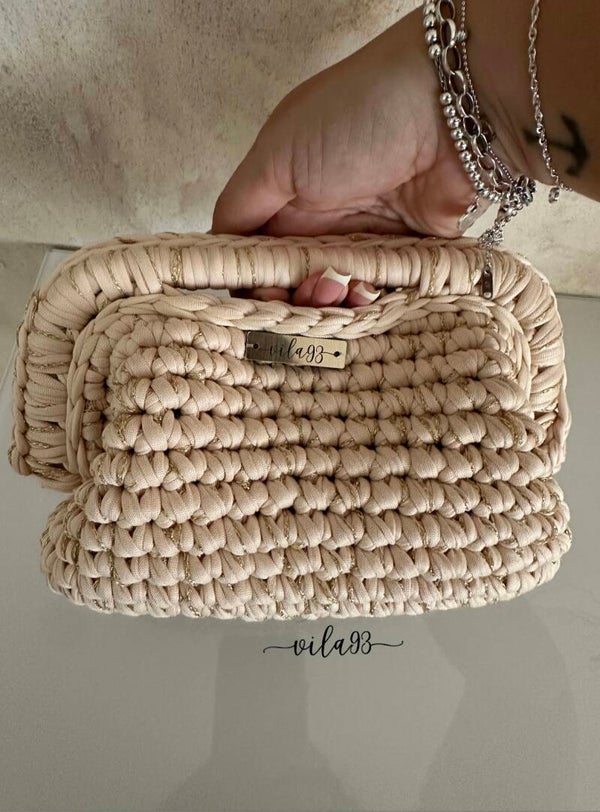 Modernes Design trifft auf liebevolle Handarbeit: Aus stabilem, naturbelassenem T-Shirt-Garn mit zusätzlichem Glitzer-Garn gehäkelt, überzeugt sie durch ihre klare Form und ihre hochwertige Verarbeitung. Ideal für Alltag, Dinner oder Event – ein Accessoire, das jedes Outfit aufwertet. Perfekt für alle, die das Besondere lieben.