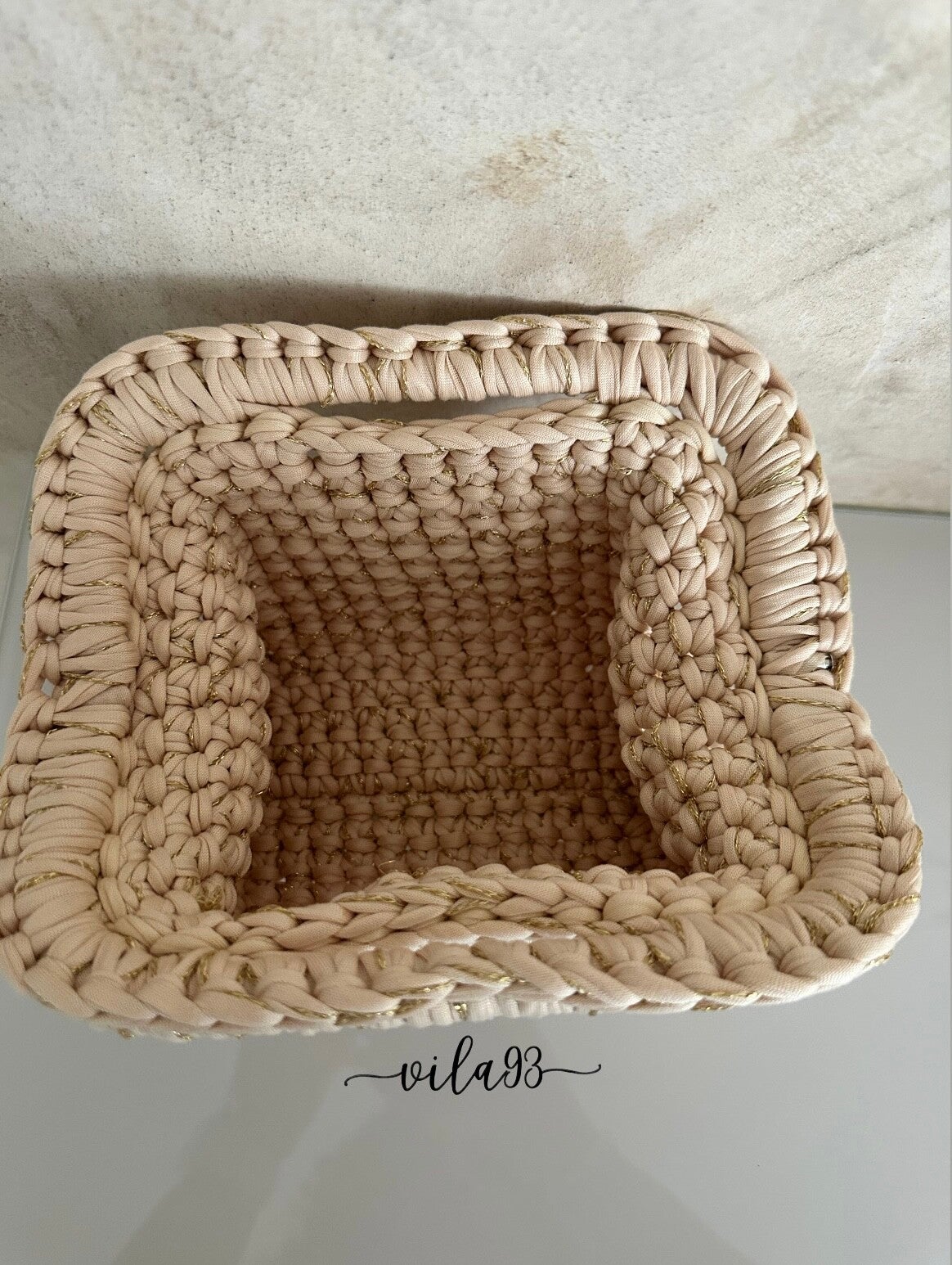 Farbe: Beige | Detail: Gold mit goldigem Glittergarn | Grösse: ca. 20x18cm | Material: 100% Polyester (T-Shirt Garn)