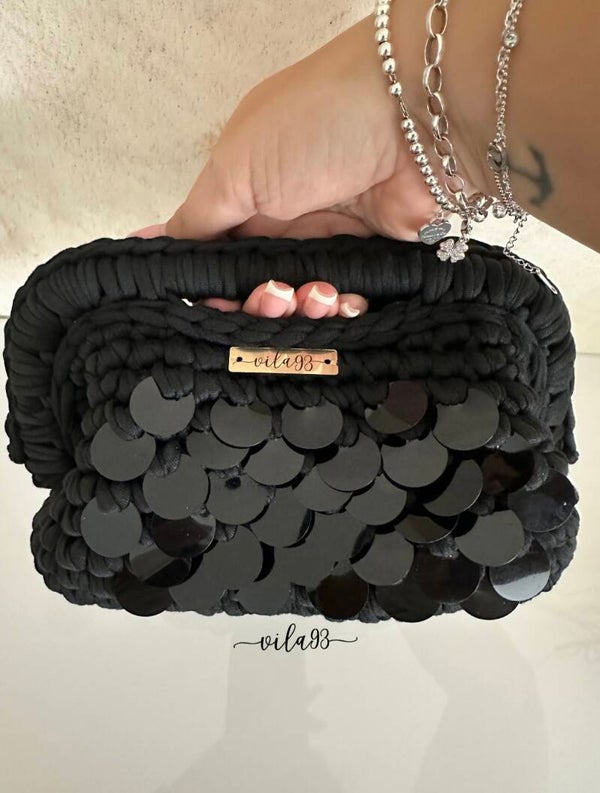 Modernes Design trifft auf liebevolle Handarbeit: Diese Clutch wird aus stabilem, naturbelassenem T-Shirt-Garn gehäkelt und mit Pailletten veredelt. Die klare Form und hochwertige Verarbeitung machen sie zum stilvollen Begleiter – ob im Alltag, beim Dinner oder auf Events. Ein echtes Statement-Piece für alle, die das Besondere suchen.